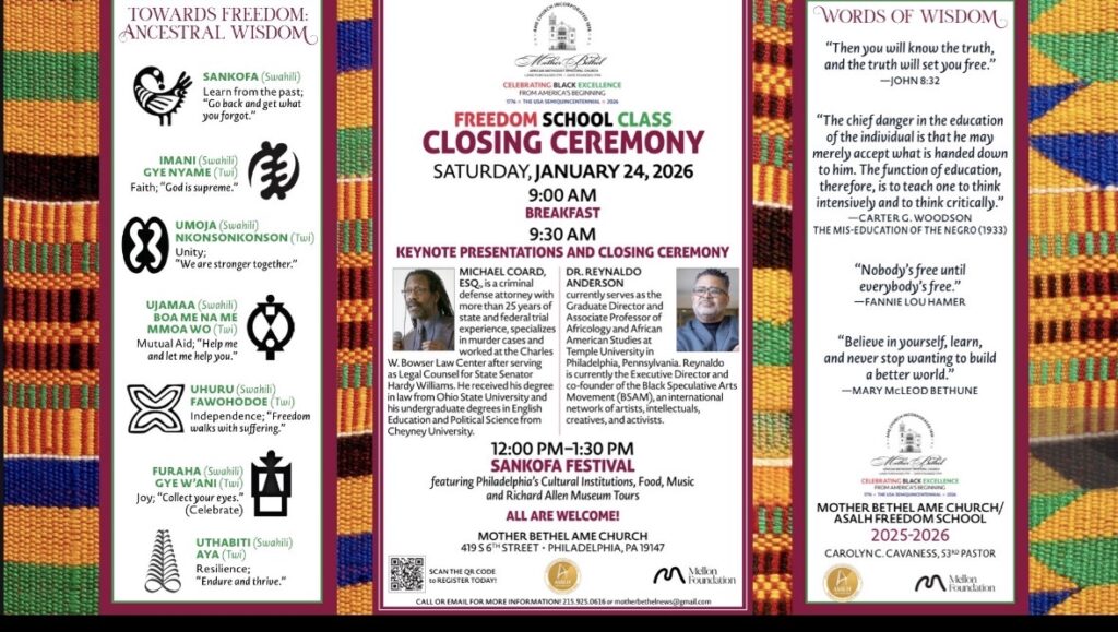 The Sankofa Celebration Closing Ceremony for the Mother Bethel AME–ASALH Freedom School marked a powerful conclusion to a week of learning, reflection, and cultural affirmation rooted in Black history and excellence. Held on Saturday, January 24, 2026, at historic Mother Bethel AME Church, the program brought together students, families, scholars, artists, and community members to honor the enduring legacy of African American life and history.
